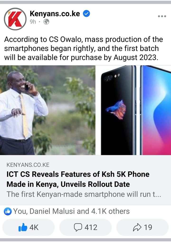 However, Cabinet Secretary serving in the Ministry of Information and Computer Technology Eliud Owalo said that the made-in-Kenya phones will be available to Kenyans by August 2023.