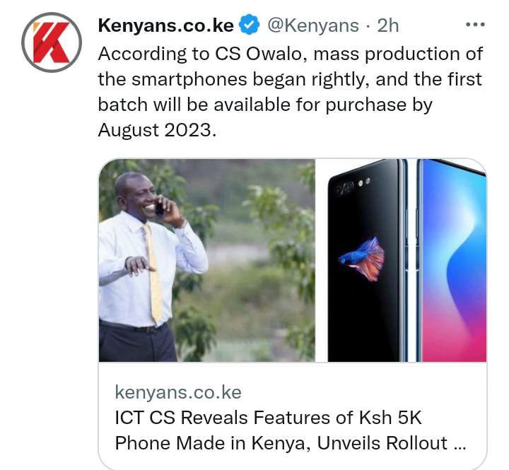 According to Cabinet Secretarty who took over from Joe Mucheru, the mass production of the smartphones have already began, and the first batch will be available for purchase by August 2023.